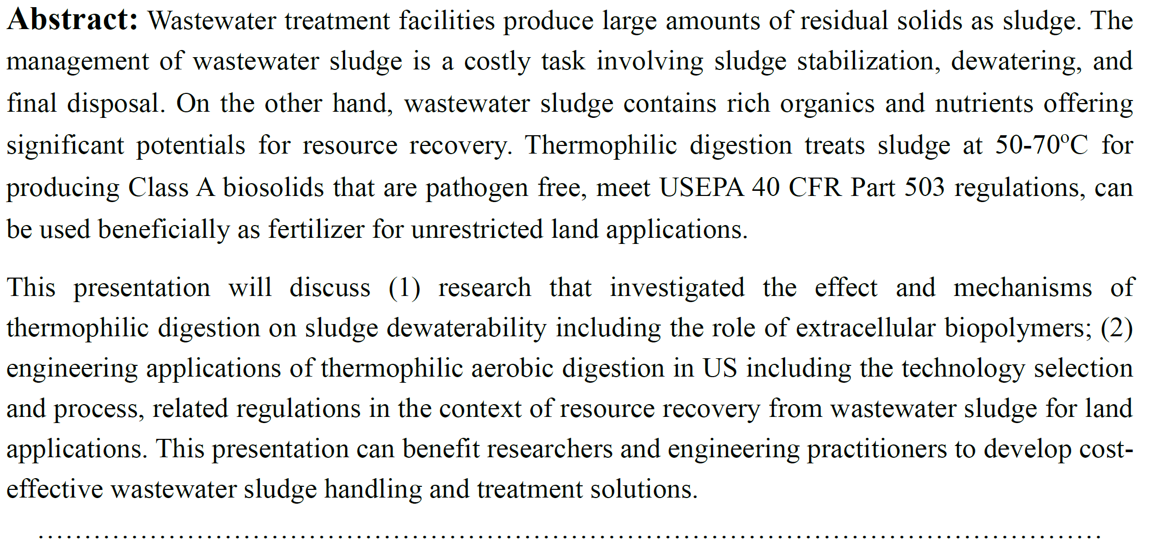 Thermophilic Aerobic Digestion of Wastewater Sludge for Resource Recovery: Research on Digested Sludge Dewaterability and Engineering Applications in US