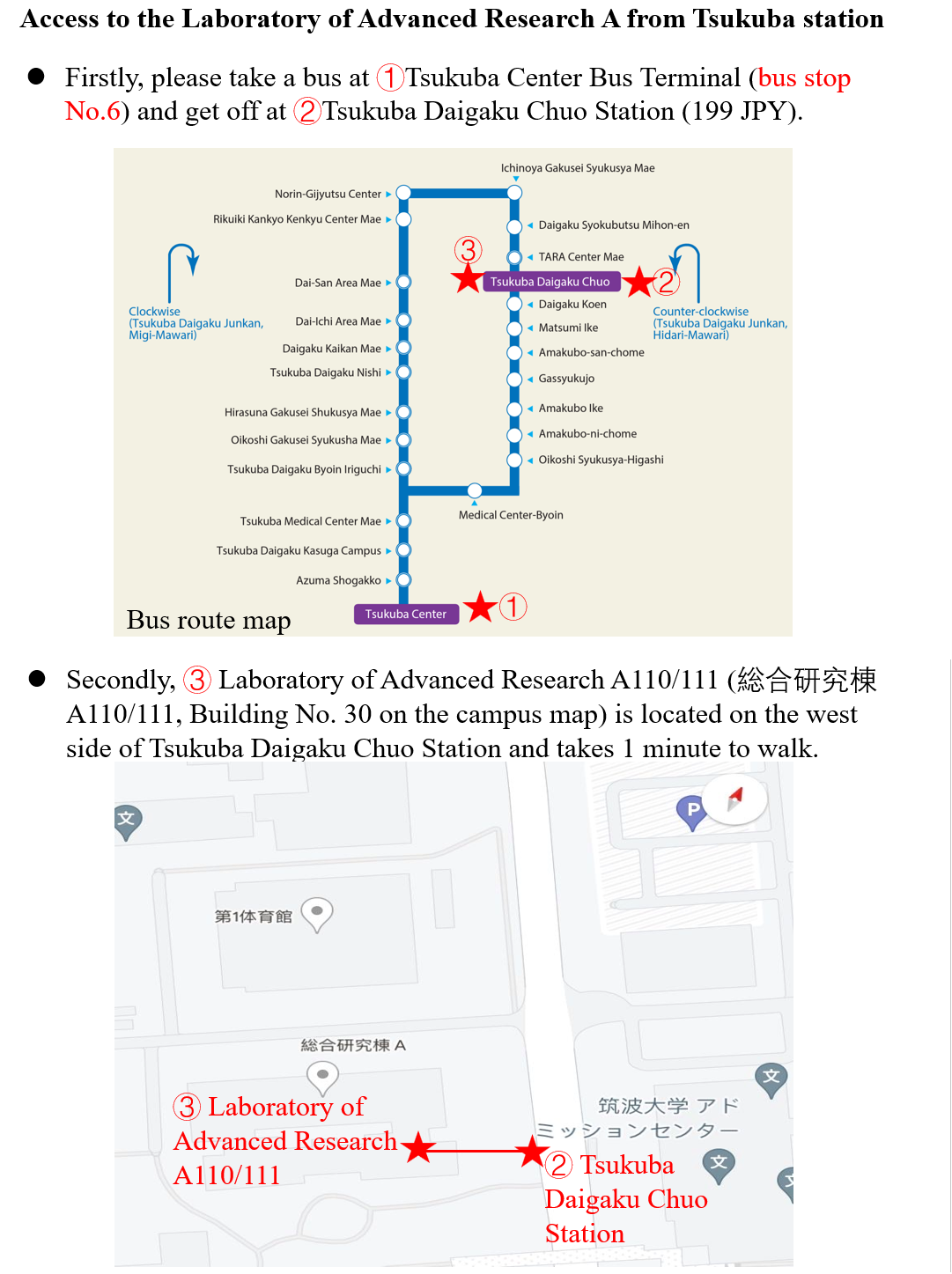 Univ. Tsukuba campus (https://www.tsukuba.ac.jp/en/about/campus-access/tsukuba-campus/), Laboratory of Advanced Research A110/111 (総合研究棟A110/111, Building No. 30 on the campus map), 1-1-1 Tennodai, Tsukuba, Ibaraki 305-8572, Japan.